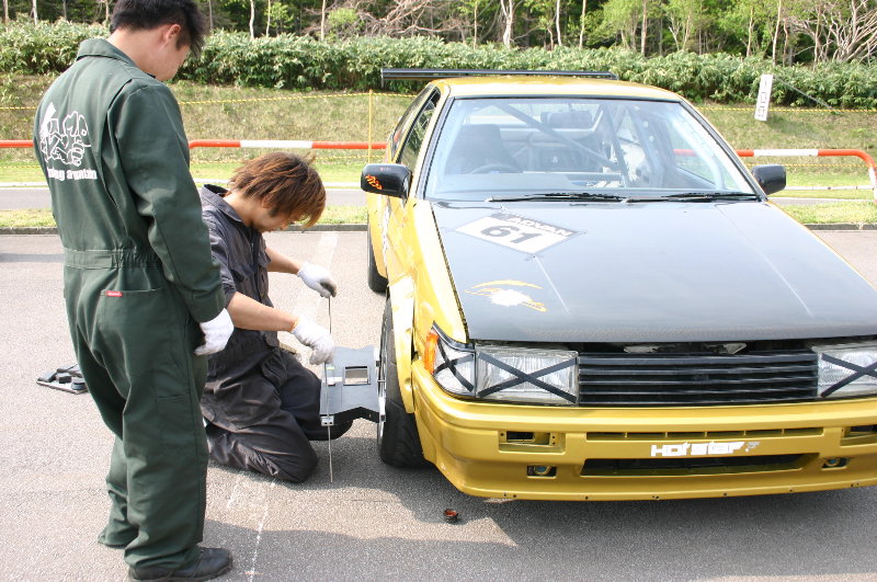 ■ アライメントを確認する中川選手のレビン、測定している道具は「JUST4」という測定器具で、