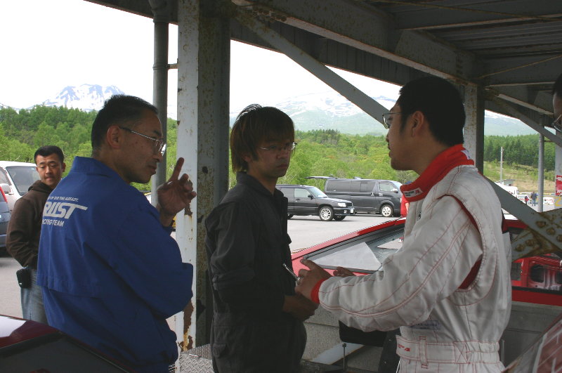 ■ 予選走行後に当社社長に状況報告する馬場選手です。