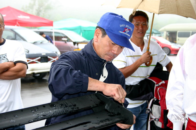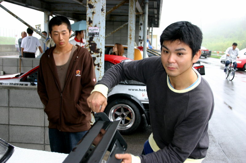 ■ GTウィングを調整しようとして、羽が落ちてしまいキョトン顔なのは「チームTOP堂」の品田選手です。
